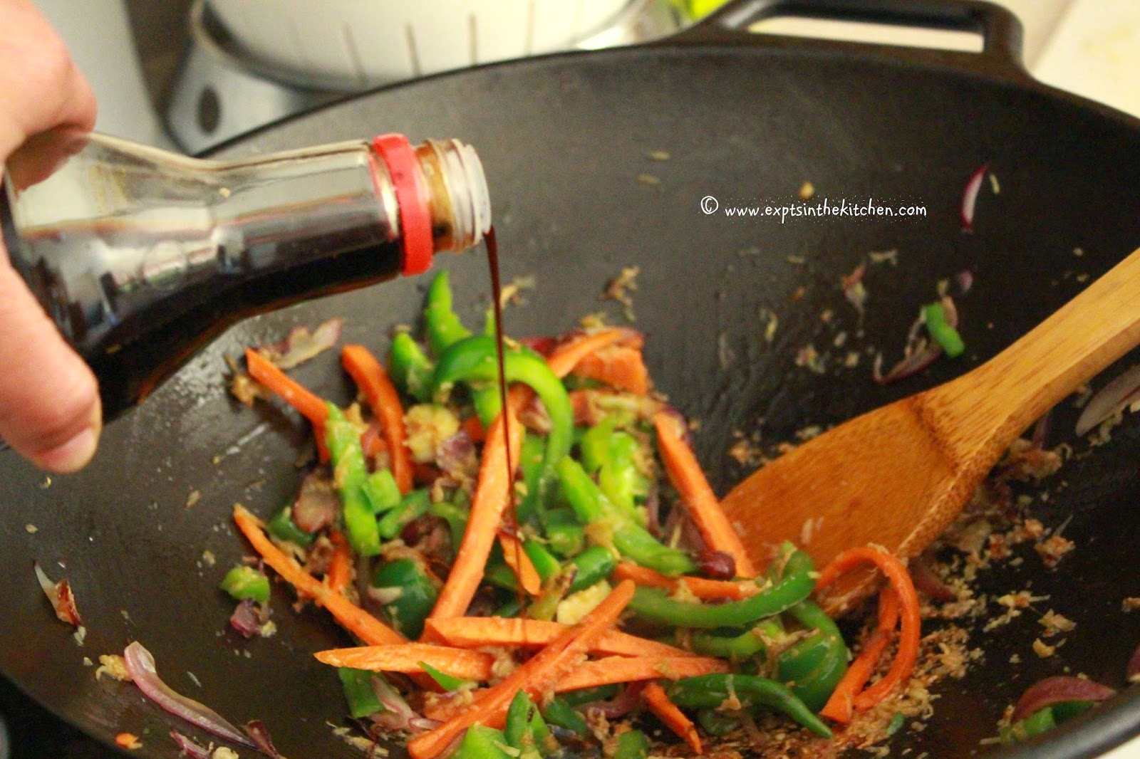 - Heat oil, add onion. Stir fry for 3-4 minutes. Then add capsicum, carrot. Stir-fry till it is soft and cooked another 2-3 minutes. Add the ginger, garlic and chilies.